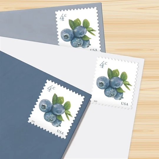 In 2022, the U.S. Postal Service issues Blueberries, a four-cent definitive stamp. The stamp will be sold in coils of 3,000and 10,000 and in panes of 20.