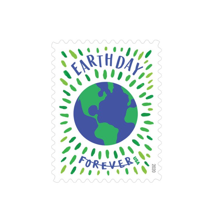 The stamp features art director Antonio Alcalá’s painting of Earth, which he created with gouache on watercolor paper. Ricky Altizer was the typographer. The design also features small green lines surrounding the planet. The title of the stamp runs across the top and the words “Forever” and “USA” appear along the bottom.