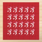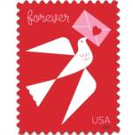 Send warm sentiments with this year’s Love stamp from the U.S. Postal Service.Geometric shapes come together to form the highly stylized white bird. Set against a rich red background. the bird caries in itsbeak a pink envelope sealed with a red heart.