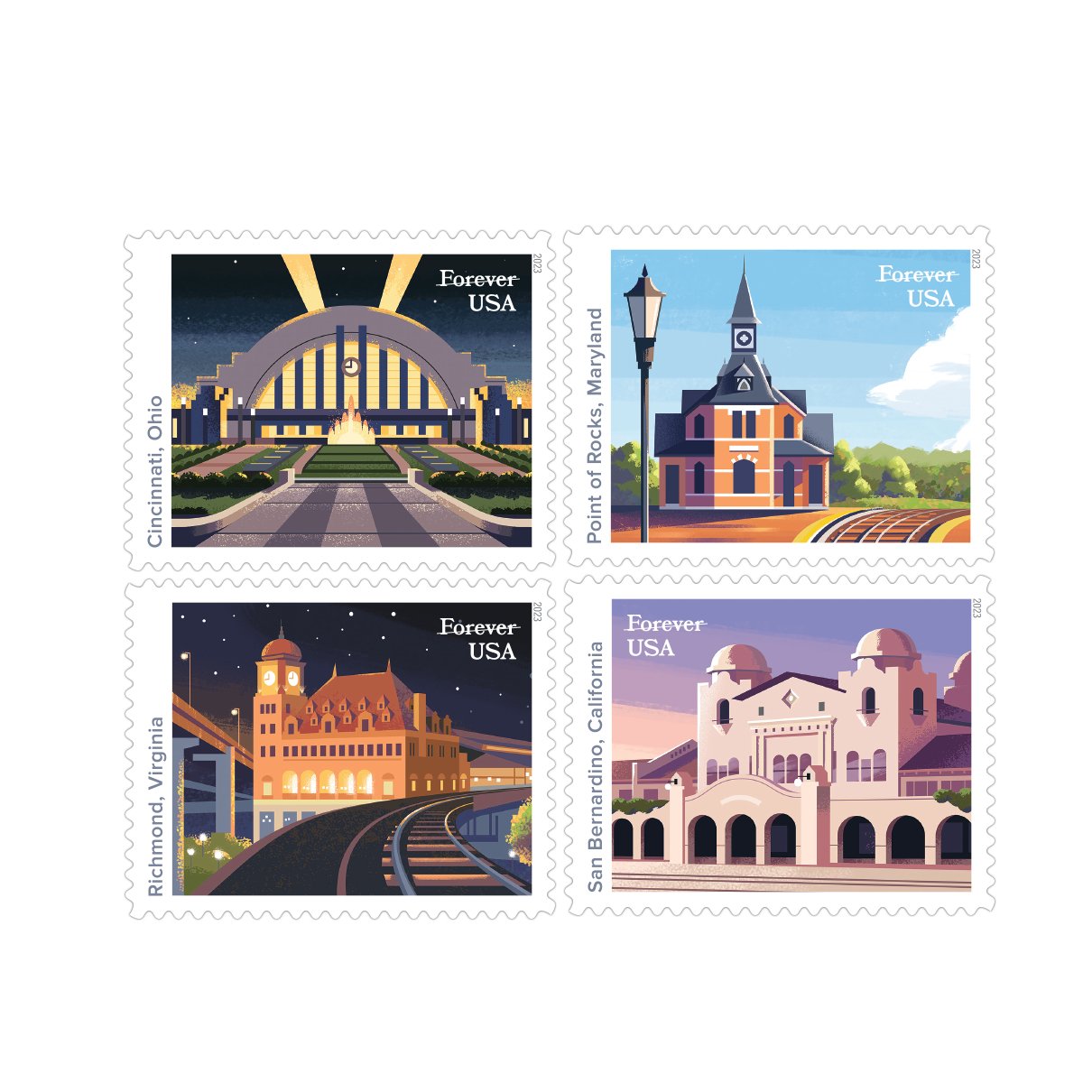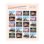 Each stamp in the pane of 20 is an illustration of a single station: the 1874 Tamaqua Station in Tamaqua, Pennsylvania; the 1875 Point of Rocks Station in Point of Rocks, Maryland; the 1901 Main Street Station in Richmond, Virginia; the 1918 Santa Fe Station in San Bernardino, California; or the 1933 Union Terminal in Cincinnati, Ohio. The pane resembles a page in an old-fashioned photo album, with the title “Historic Railroad Stations of the United States” and drawings of a train and a one-ride ticket in the header.