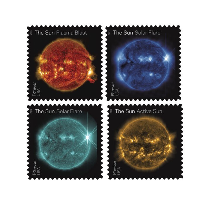 The images on these stamps come from NASA’s Solar Dynamics Observatory, a spacecraft launched in February 2010 to keep a constant watch on the Sun from geosynchronous orbit above Earth. The striking colors in these images do not represent the actual colors of the Sun as perceived by human eyesight. Instead, each image is colorized by NASA according to different wavelengths that reveal or highlight specific features of the Sun’s activity.